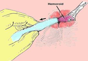Fig. 2 - Evidentierea hemoroidului prin retragerea compresei introduse in canalul anal (4)
