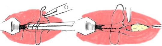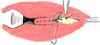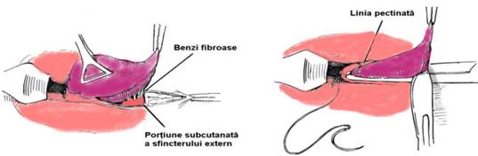 Fig. 5 - Continuarea surjetului dupa retragerea pensei incluzand cele doua margini a liniei pectinate si portiunea subcutanata a sfincterului extern (4)
