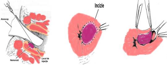 Disectia este realizata in afara marginii externe a sfincterului extern. Pielea anala poate fi, de asemenea, sectionata. Raman mucoasa si venele profunde care intra in masa hemoroidala. Se aplica o pensa dreapta, pe care se practica o sutura transfixianta incepand de la varful masei hemoroidale (Fig. 4)