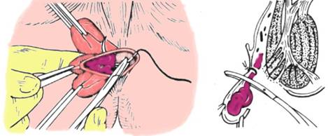 Fig. 11. Tehnica Milligan-Morgan: ligatura pediculului hemoroidal cu fir de catgut cromat, transfixiant (stanga); sectiunea pachetului hemoroidal (dreapta) (1)