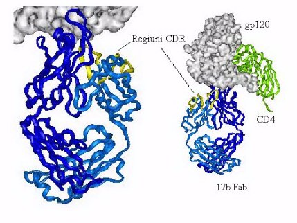 cu anticorpul 17b (lantul heavy chain in albastru inchis si lantul light chain