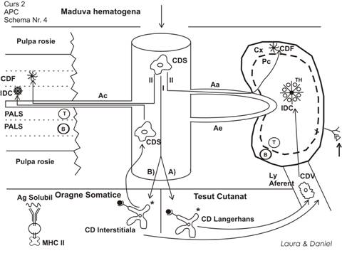 calea antidromica si reintra in circulatie, se transforma din nou in CD Sangvine. Sub aceasta forma patrund in splina, luand calea arteriolei centrale si se fixeaza in PALS intern, unde se transforma morfologic in CD Interdigitate si prezinta Ag catre LTH