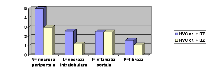 In urma analizei datelor studiului , in concordanta cu datele din literatura, am observat ca in hepatita cronica cu virus C asociata cu diabetul zaharat leziunile hepatice sunt mai severe decat in absenta acestuia, in special leziunile de necroza periportala si necroza intralobulara. Acest lucru ar putea fi explicat de faptul ca diabetul se asociaza cu dislipidemie si steatoza hepatica datorita insulinorezistentei, factor generator de necroza hepatocitara si fibroza hepatica. De asemenea, terapia cu anumite antidiabetice orale ar putea reprezenta un factor adjuvant al leziunilor hepatice .
