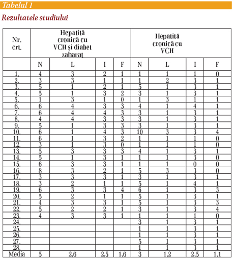 ● pacientii cu hepatita cronica cu VCH au leziuni de necroza periportala mai severe decat cei fara diabet zaharat (media 5 fata de 3);