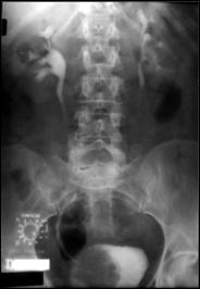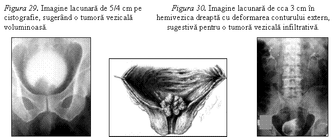 4.1. Radiografia renovezicala simpla si UIV raman examenele de baza pentru diagnosticul etiologic al oricarui pacient cu hematurie. Tumorile vezicale au drept semn radiologic cardinal imaginea lacunara pe cistograma urografica. Tumorile infiltrative pot induce modificari ale supletii peretelui vezical, care devine rigid, inextensibil, retractat etc. in zonele patologice. Ureterohidronefroza sau rinichiul mut sunt rezultatele invaziei si obstructiei ureterelor intramurale induse de tumorile solide, infiltrative (Fig.27,28,29).
