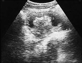 Figura 34. a,b. Aspecte ecografice de tumora vezicala - transductor abdominal.