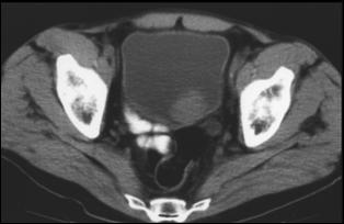 lacunara de 2,8/2 cm, in aria vezicii urinare, sugerand tumora