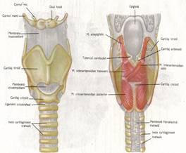 Laringele, alcatuit dintr-un schelet cartilaginos, indeplineste functional rolul de a proteja calea respiratorie, ca si rolul unui organ al fonatiei. Este format din unirea a trei cartilaje neperechi: tiroid, cricoid si epiglota, si trei cartilaje perechi: aritenoide, corniculate si cuneiforme, articulate intre ele si prezentand ca mijloace de unire, ligamente si membrane. Laringele poseda doua categorii de muschi: extrinseci si intrinseci, care dupa actiunea lor sunt: dilatatori ai glotei, sau constrictori ai glotei si tensori ai corzilor vocale. Laringele este un organ cavitar, captusit de o mucoasa si prezinta in interior doua perechi de plici dispuse anteroposterior. Plicile superioare se numesc ventriculare sau falsele coarde vocale, iar cle inferioare, plicile vocale - coardele vocale propriu-zise.