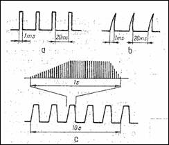 Terapia prin faradizare se foloseste la excitarea cu impulsuri dreptunghiulare a muschilor scheletici (Figura 4.1,a). Pentru muschi paralizati se pot utiliza curenti neofaradici, cu alura exponentiala (b), sau impulsuri modulate in amplitudine cu impulsuri trapezoidale (c). In vederea obtinerii unei contractii accentuate, frecventa de repetitie a trenurilor de impulsuri este de 40.100 Hz.