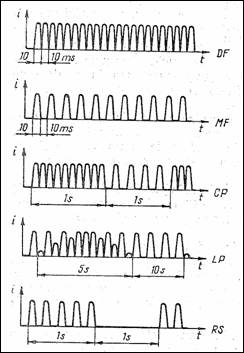 Utilizarea curentilor diadinamici (curenti Bernard) are loc in artroze, perturbatii circulatorii, mialgii, reumatism, traumatisme. Figura 4.2 prezinta cele cinci forme de unda folosite (valoare efectiva maxima de 20 mA): DF (diphas fixe) - curent alternativ de 50 Hz redresat dubla alternanta; MF (monophas fixe) - la fel, dar monoalternanta; CP (modul en courtes priodes) - semnal obtinut prin comutarea celor doua semnale anterioare; LP (modul en longues priodes) - MF modulat in amplitudine sumat cu MF; RS (rhytme syncop) - MF plus pauza. Semnalele pot sau nu avea componenta continua (0.10 mA). Combinarea curentilor diadinamici cu terapia ultrasonora continua poate detecta si trata puncte dureroase (trigger-points) in inflamatii ale tesutului conjunctiv.