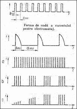 Electromasajul foloseste curenti Trbert (Figura 4.3) de forma dreptunghiulara si amplitudine constanta. Tratamentul se individualizeaza cu privire la amplitudinea si locul aplicarii semnalelor, in vederea obtinerii senzatiei de vibratie.