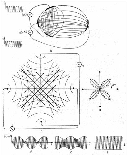 In Figura 4.5, pentru cazul interferentei statice, sunt figurate liniile de camp intr-un volum conductor omogen (a), linii echipotentiale in acelasi mediu (b), vectorul intensitate de interferenta (i = i1 + i2) (c), modulatia totala de amplitudine (100%) pe directia 45o a vectorului i (d), interferenta partiala pe o directie oarecare (e) si forma curentului pe directiile perpendiculare ale electrozilor (f).