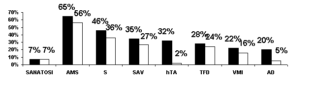 Riscul profesional este reprezentat de un cumul de noxe fizice, fizico-chimice si ergonomice. Analiza integrata pentru starea de sanatate a lotului test a evidentiat o prevalenta scazuta a subiectilor "sanatosi clinic" (doar 7%), restul prezentand o morbiditate polimorfa; cele mai frecvente sunt afectiunile musculo-scheletale, spasmofilia, sindromul asteno-vegetativ, hipotensiunea arteriala si afectiunile dermatologice. Lotul martor a prezentat acelasi procent de "sanatosi clinic"; patologia inregistrata este comparabila cu a lotului luat in studiu, cu exceptia afectiunilor dermatologice si a hipotensiunii arteriale (p<0.001), dupa cum se poate vedea in Figura 1. Acest aspect sustine diferenta privind riscul profesional intre cele doua loturi si sugereaza etiologia posibil ocupationala a afectiunilor inregistrate.