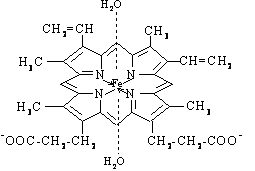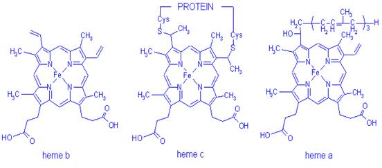 Prin includerea ionului Fe2+ in nucleul protoporfirinei IX rezulta hemul. Dintre cele sase valente ale ionului Fe2+, patru sunt satisfacute de protoporfirina IX, la valentele a 5-a si a 6-a, perpendiculare pe planul protoporfirinei, putandu-se lega diferiti liganzi (O2, CO, NO).