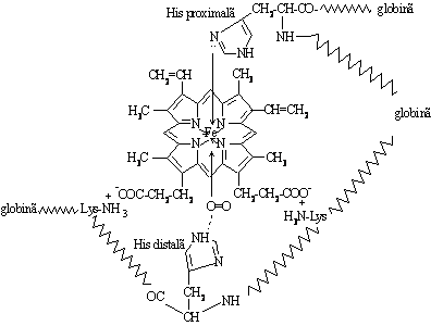 Legarea O2 la Mb si Hb. In oximioglobina (MbO2) si oxihemoglobina (HbO2) (forme cu oxigen), la a 6-a valenta a fierului se leaga molecula de oxigen (vezi figura).
