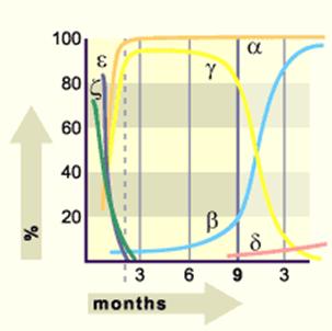 Din luna a 3-a, incepe sa se sintetizeze si HbA (hemoglobina adulta), dar aceasta predomina abia dupa nastere. In viata extrauterina, sangele mai contine si o alta hemoglobina adulta, HbA2.