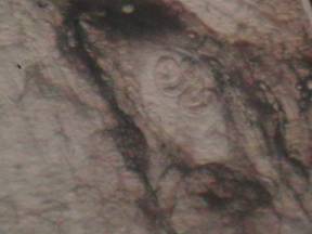 larve in stadiul de spiralare, unele larve prezentand numai in inceput de spiralare. In acest stadium larvele sunt dezvoltate aproape complet. Cuticula larvelor este transparenta, bine conturata, structura interna a parazitului este bine marcata, realizand astfel un contrast decelabil fata de fibrele musculare.In stadiul de spsiralare larvele sunt sigur infestante.Cu atat mai mult, depistarea lor necesita o examinare atenta a intregului compresor, urmarind si zonele periferice ale fiecarui segment de carne,
