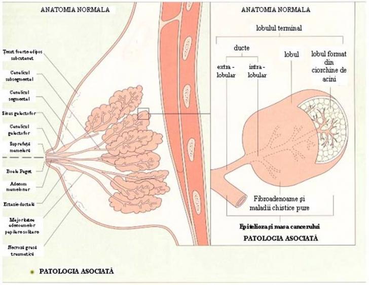Fig. 1. Structura normala a sanului. Puncte de plecare ale cancerului mamar