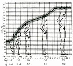 Figura nr. 1 Diagrama cresterii medii in lungime a corpului, cu unele repere ale greutatii si a rapoartelor segmentelor cefalic/talie, inferior/superior