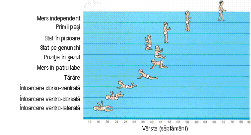 ▪ ridicarea capului din pozitie ventrala ▪ ridicarea capului si a umerilor din pozitie ventrala ▪ intoarcerea ventralo-laterala ▪ intoarcere ventralo-dorsala ▪ intoarcere dorsalo-ventrala ▪ tarare ▪ pozitia in sezut definitiva ▪ mers in patru labe ▪ stat in picioare cu sprijin ▪ stat pe genunchi ▪ primii pasi cu sustinere bimanuala ▪ stat in picioare ▪ mers cu sustinere unimanuala sau autosustinere ▪ urcarea unei scari in patru labe ▪ mers independent |