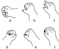 In ceea ce priveste comportamentul de prehensiune si cel de manipulare a obiectelor, primul an de viata reprezinta o etapa de achizitii fundamentale, diversificate mai ales pe linia eficientei. Analiza acestor comportamente vizeaza evaluarea dezvoltarii motrice a doua planuri: miscarea bratului (ceea ce reprezinta 75% dintr-un comportament de prehensiune) si ajustarea mainii pentru apucarea obiectului. Fiecare dintre cele 2 planuri are un traseu de evolutie precis determinat, cu cate 3 forme succesive speciale. Pentru brat acestea sunt: baleiajul - miscarea din umar, posibila dupa 5-6 luni prin instalarea controlului voluntar la nivelul acestei articulatii; miscarea parabolica - din cot (dupa 6-7 luni); miscarea directa - din incheietura pumnului(dupa 8 luni). Functionalitatea mainii parcurge si ea 3 stadii speciale (vezi figura nr. 8): apucarea cubito-palmara a obiectului (a - 5-6 luni); cea digito-palmara (b,d - 6-7 luni) si cea radio-digitala sau in penseta (c,e,f,). Aceasta are 2 forme: forma inferioara (c,e - 7-8 luni) si cea superioara (precisa, numita si penseta superioara, f - dupa 9 luni).