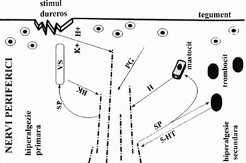 Modularea periferica. Existenta unui proces complex de modulare periferica declansata de actiunea unui stimul dureros este sugerata inca din 1942 de Lewis, care descrie fenomenul de "triplu raspuns" al tegumentului in urma aparitiei unui stimul dureros. Autorul descrie inrosirea tegumentului, prezenta edemului si a unei sensibilitati exagerate la acest nivel ("rubor, tumor, dolor, calor"), urmate de extinderea fenomenelor si la tegumentele invecinate, care nu au fost sub actiunea directa a stimulului dureros initial. Deci, alaturi de actiunea directa a stimulului nociceptiv este sugerata si aparitia unor fenomene de tip inflamator, confirmate de studiile ulterioare (Fig. 3).