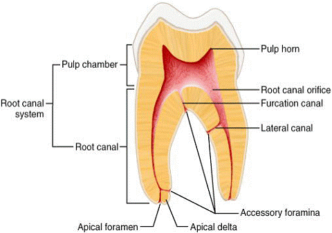 Contururile acestui sistem corespund conturului dintelui, dar factori, precum, imbatranirea fiziologica, bolile si ocluzia, toti modifica dimensiunile prin producerea de dentina secundara si tertiara si a cementului. Sistemul endodontic este impartit in doua portiuni: camera pulpara situate in coroana anatomica a dintelui si pulpa radiculara situate in radacina anatomica. Alte componente sunt reprezentate de coarnele pulpare, canalele accesorii, canalele laterale si furcale, orificiile canalelor, delta apicala si foramenul apical(figura 2) . Un canal radicular incepe sub forma de palnie, in general la nivelul liniei cervicale sau apical de aceasta si se termina la nivelul foramenului apical, care se deschide la nivelul radacinii in dreptul apexului sau pana la 3mm fata de apex. Aproape toate canalele radiculare sunt curbe, in general in sens vestibulo-oral. Aceste curburi pot prezenta probleme in etapele de curatire, deoarece ele nu apar pe radiografiile facute din incidenta normala. Incidentele angulate sunt necesare pentru a determina prezenta lor, directia si gradul curburii. O curbura poate fii graduala a intregului canal sau poate fi foarte ascutita aproape de apex. Canalele cu dubla curbura sub forma de S pot fi de asemenea intalnite. In cele mai multe cazuri numarul canalelor corespunde cu numarul radacinilor, desi o radacina ovala poate avea mai mult de un canal.