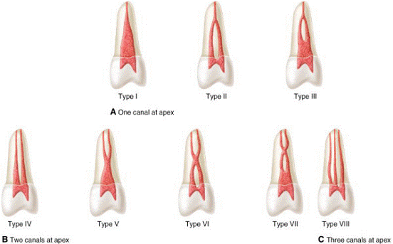 Medicul trebuie sa fie familiar cu variatele cai pe care canalele le pot lua pana la apex. Sistemul este complex, canalele putand sa se ramifice, divide si apoi uni. Weine a clasificat sistemul endodontic in patru clase de baza ce se pot regasii in orice radacina(figura 8).