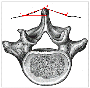 q translatarea proiectiilor A'B'C' intr-un plan orizontal comun si determinarea unghiului a , dintre proiectiile inaltimilor, ca masura a rotirii relative a vertebrelor (fig. 3.b)