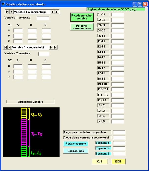 Programul este conceput astfel incat sa poata furniza si valoarea unghiului de rotire intre doua vertebre care definesc un segment de coloana. Eticheta Alege prima vertebra a segmentului cere operatorului introducerea simbolului vertebrei de inceput al segmentului in caseta TextBox alaturata. Eticheta Alege ultima vertebra a segmentului indica introducerea simbolului ultimei vertebre a segmentului. Butonul de comanda Rotatie segment declanseaza desfasurarea secventei de cod prin care se opereaza cu coordonatele prelevate pentru vertebrele indicate si afisarea rezultatului in caseta de text alaturata etichetei Segment 1. Aplicatia este prevazuta cu posibilitatea alegerii a trei segmente, prin comenzile repetate Rotatie segment si Segment nou.