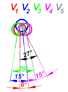 In figura 6 este prezentat un desen ilustrativ pentru tipul de informatie pe care il poate furniza programul. Sunt reprezentate simbolic cinci vertebre succesive, care alcatuiesc un segment de coloana. Corpul fiecarei vertebre este reprezentat printr-un cerc, iar directia apofizei vertebrei, printr-un segment de dreapta orientat. Pentru claritatea ilustratiei fiecare vertebra a fost figura in alta culoare. Sunt redate unghiurile dintre perechile de vertebre succesive V1-V2, V2-V3, V3-V4, V4-V5 si unghiul dintre prima si ultima vertebra a segmentului, V1-V5.