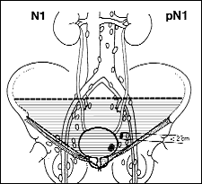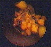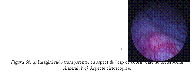 c) Prezenta unei tumori vezicale voluminoase in dreptul unuia dintre orificiile ureterale, prezenta asociata sau nu cu ureterohidronefroza sau mutism renal de partea respectiva. Daca nu se poate identifica cistoscopic cu certitudine orificiul ureteral respectiv cu certificarea endoscopica a neinteresarii acestuia de procesul tumoral, trebuie sa avem in minte posibilitatea unei protruzii tumorale prin orificiul ureteral respectiv si sa investigam in continuare aceasta posibilitate.
