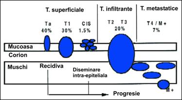 30% din tumorile vezicale superficiale cu grad 3 de anaplazie progreseaza spre tumora vezicala infiltrativa pT2, in timp ce 18 % din tumorile pT1 evolueaza spre infiltratie.