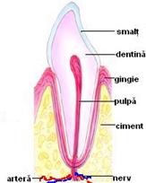 Fiecare dinte are radacina, aflata intr-o alveola adanca in osul maxilar, colet, care se afla in gingie si coroana, care proemineaza in cavitatea bucala. Smaltul dentar dur acopera coroana in exterior, aparand dintele de distrugere prin roadere si patrundere de microbi. Sub smalt se afla o substanta compacta asemanatoare cu cea a osului. Partea interna a dintelui este cava. In tesuturile moi conjunctive, care se afla in cavitatea dintelui, se ramifica vase sangvine si nervi.