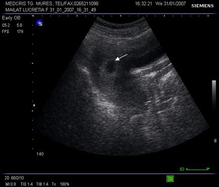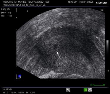 Fig. nr.11. Sac ovular intrauterin la o sarcina de 5 sapt., ecografia abdominla ( zona anecogena rotunda marcata cu sageata )