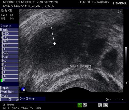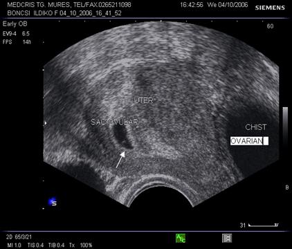 Fig nr. 8. Sarcina 5 sapt la ecografia transvaginala :sac ovular cu vezicula vitelina evidenta marcata cu sageata, retrouterin ovar chistic
