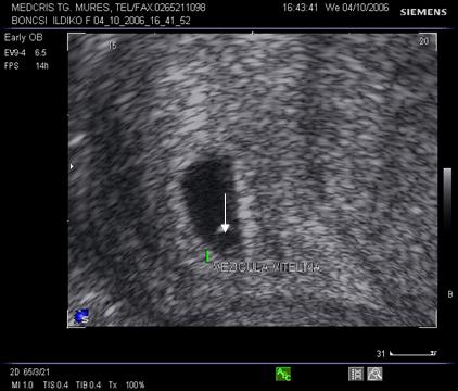 vezicula vitelina (sacul lui Yolk) - marime, tonus; normal rotunda cu f intre 3,5 si 6 mm.