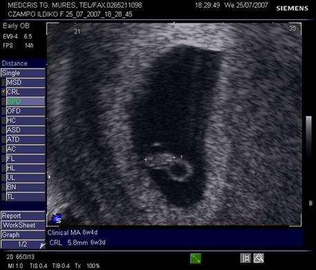 Fig. Nr.7. Sac gestational intrauterin ( cu sageata ) la ecografia transvaginala, coroana trofoblastica