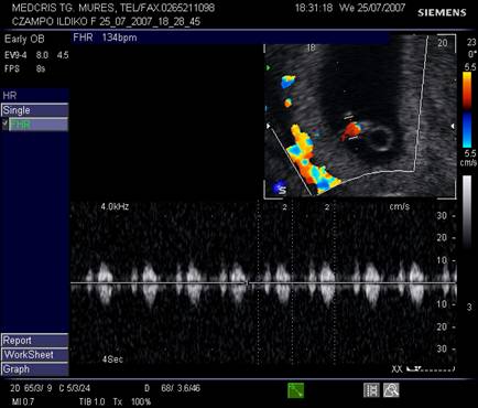 Fig nr. 13. Embrion cu activitate cardiaca, examen Doppler pulsat si Color Flow Map, ritm cardiac de 134 batai pe minut