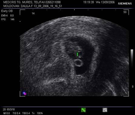 embrionul: 5 ½ sapt pe cale vaginala, 6 - 6 ½ sapt. pe cale abdominala