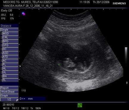 marimea embrionului/fatului (crown rump length = CRL = lungimea craniocaudala, BPD = diametrul biparietal = Biparietal diameter)