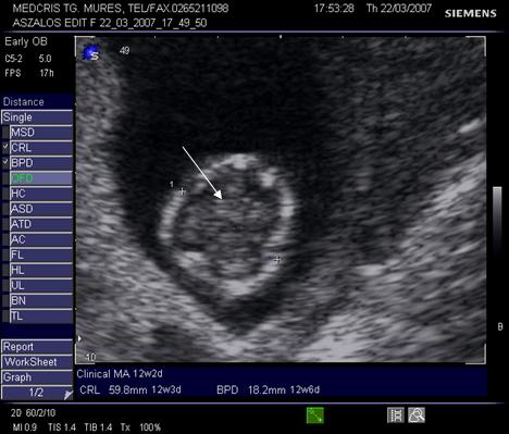 Fig. nr. 15. Sarcina 8 sapt, aparitia veziculei telencefalice anecogene in extremitatea cefalica ( sageata )