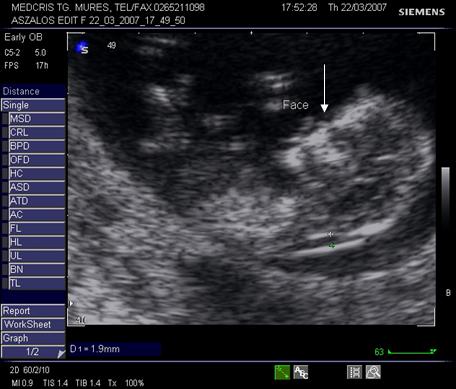 Fig. nr.29. Sarcina 12 sapt. : masurarea pliului nuchal si aparitia osului nazal ( cu sageata )