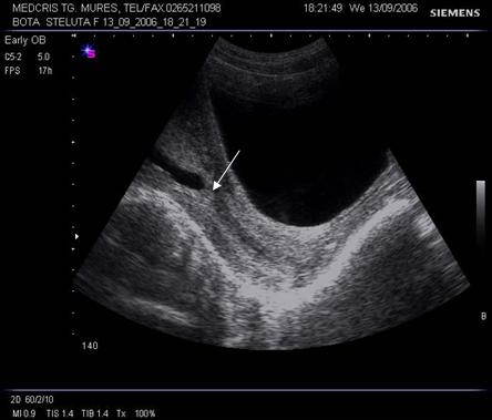 Fig. nr. 33. Col uterin la o sarcina de 13 sapt., ecografie abdominala (sageata indica orificiul cervical intern )
