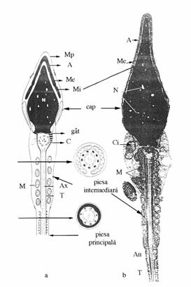 acrozomiala interna C - centriol proximal M - mitocondrii Ax - axonema T - teaca fibroasa An - anulus distal N - nucleu Ci - citoplasma