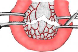 - se practica un plan total posterior, cu fire separate, resorbabile, innodate in lumen, tinand in tensiune cele doua fire de reper;