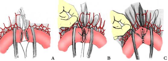 - se practica planul total anterior cu sutura inversanta, cu nodurile in lumen;