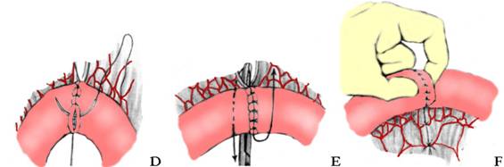 Fig. 3 Anastomoza termino-terminala: trecerea firelor tractoare (A), plan total posterior (B), plan total anterior (C), plan sero-seros anterior (D), plan sero-seros posterior (E), controlul permeabilitatii gurii (F) (4)