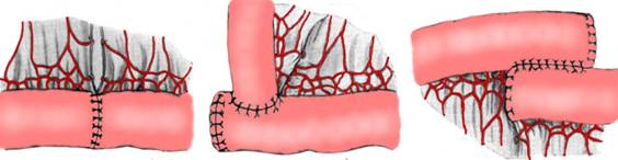 Fig. 4 Enteroanastomaoza: termino-terminala (stanga), termino-laterala (mijloc), latero-laterala (dreapta) (1)