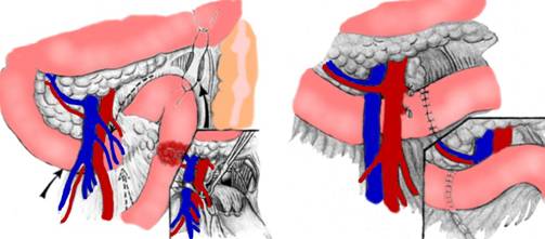 Rezectiile inalte, din apropierea unghiului duodeno-jejunal, care pun probleme datorita vascularizatiei duodenale, fixitatii sale si vecinatatii pediculului mezenteric superior (Fig. 11).